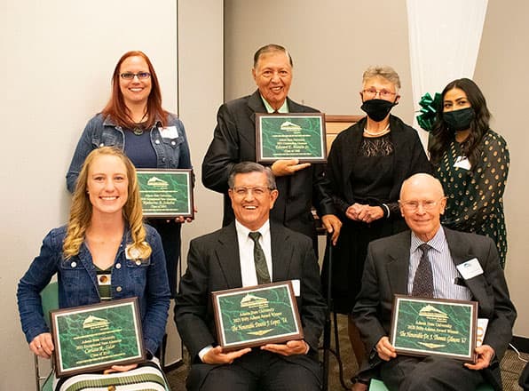 Alumni joined in the Homecoming of the Century on Friday morning. Door prizes, coffee, and burritos warmed golfers before teeing off for Alumni Golf Outing. Several reunited first at the reception and then at the annual Awards Banquet which honored alumni award recipients, including, 2021 Exceptional New Alumna Carissa Sidor, Class of 2016 and 2017; 2021 Billy Adams Award Dennis Lopez, Class of 1974 and 1978; 2020 Billy Adams Award J. Thomas Gilmore, Ph.D., Class of 1967 and 1968; standing: 2020 Exceptional New Alumna Katherine Schultz, Class of 2015; 2021 Outstanding Alumnus Edward Atencio, Class of 1968 and 1973; President Cheryl D. Lovell, Ph.D., and Alumni Relations and Engagement Director Ashley Maestas, Class of 2013 and 2020. Not pictured, 2020 Outstanding Alumnus William Manzanares, Class of 1967.