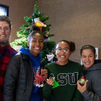 Left to right, William Clark, Ki’Asha Harris, MacKenzie Swanson, Danielle Jimenez, Stephanie Ruiz continue with the Chemistry Department’s holiday tradition of creating chemistry-themed ornaments to decorate the Chemtree, located on the third floor of Porter Hall.