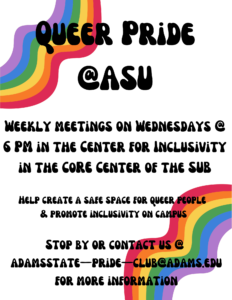 Adams State University is committed to creating a safe and open space for students, staff, alumni and community members who identify as LGBTQ+.