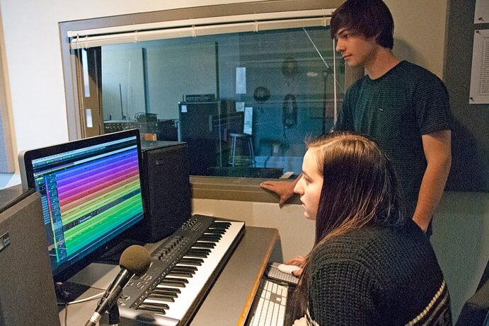 The music lab contains thirteen stations equipped with new IMac computers, MIDI keyboards, Pyware (the industry standard marching band software), Garageband for music recording, and the latest Finale software (the industry standard music notation software). The lab also contains approximately 2,000 CDs, CD and DVD burners, CD artwork software, and video editing software. In addition, students can access the Naxos Music Library from the computers in the lab, a streaming database with over 2 million tracks. This is facility is the primary classroom for MUS 103, Intro to Music Technology, with students working on the computers and software both in and outside of class. In addition, the course MUS 104, 204, 208, 304, and 308 have students working on class projects in this lab. Students also use the music lab for the course “Marching Band Techniques” and frequently use the technology for individual projects such as arranging music for ensembles.