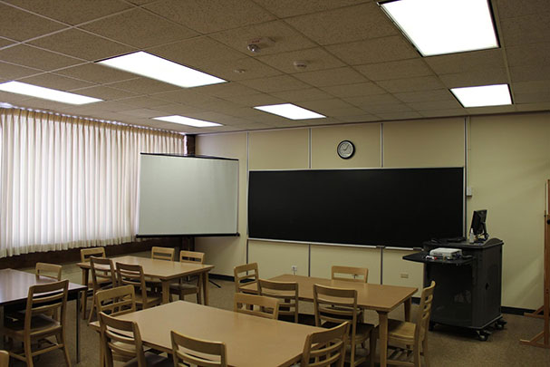 • Features: Whiteboard, chalkboard, computer projector, tables and chairs