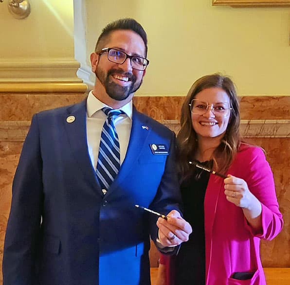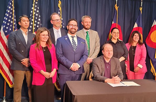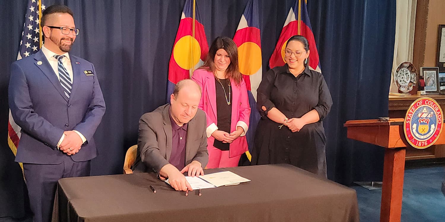 Colorado Governor Jared Polis signs into law House Bill 23-1037, on April 12, 2023 at the State Capitol. Adams State University Alumnus and District 62 State Representative Matthew Martinez, Class of 2013, sponsored the legislation. The new law permits incarcerated students sentenced for nonviolent felonies to have earned time deducted from the their sentence for each accredited degree or other credential awarded by a regionally accredited institution of higher education.