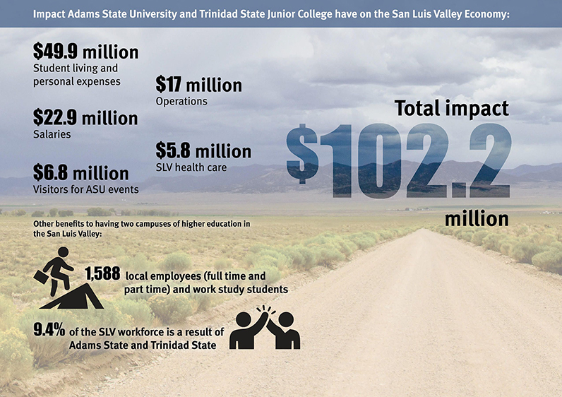A new economic impact study released in December 2018 shows an estimated $102.2 million return to the San Luis Valley economy because the campuses of Adams State and Trinidad State Junior College are located in Alamosa. Of that figure, Adams State accounts for 82 percent or $83.5 million.