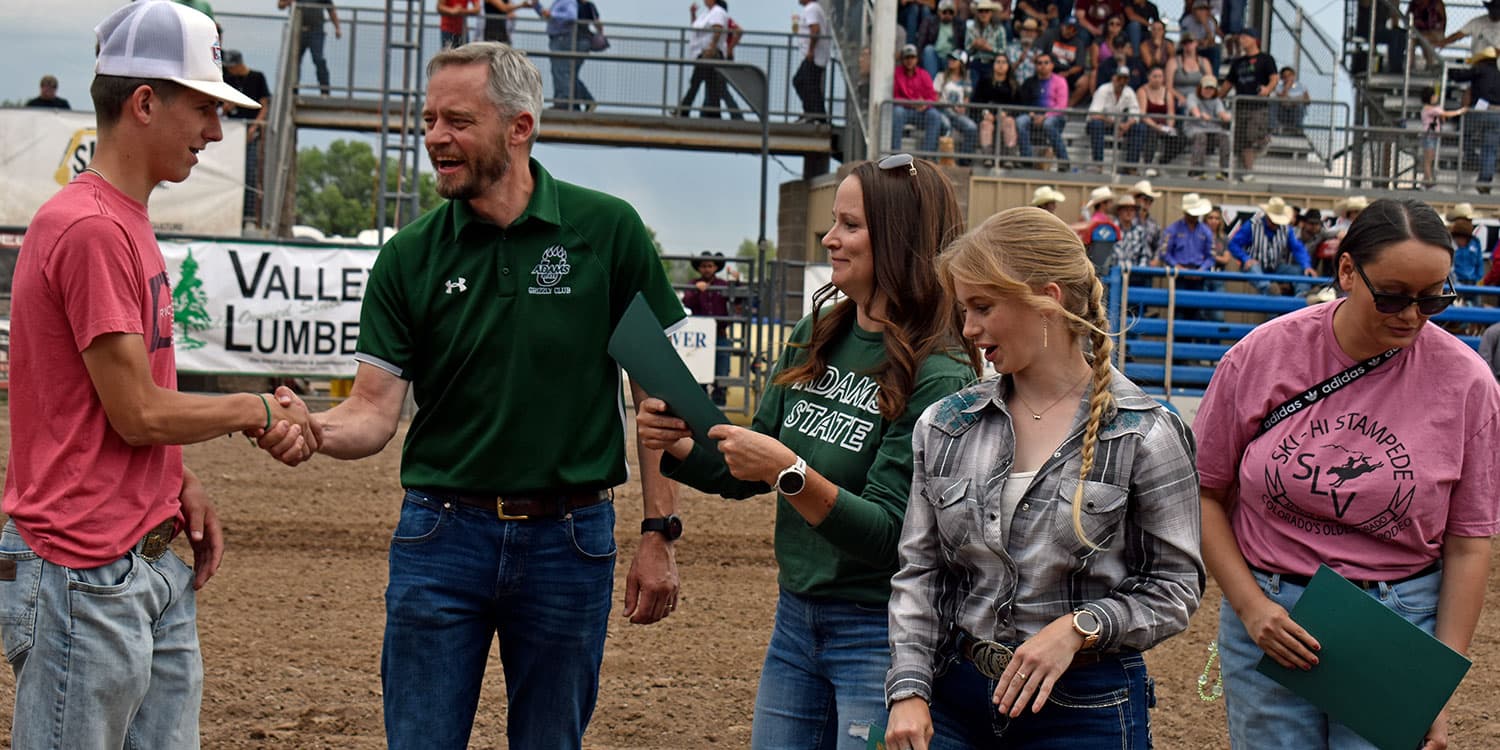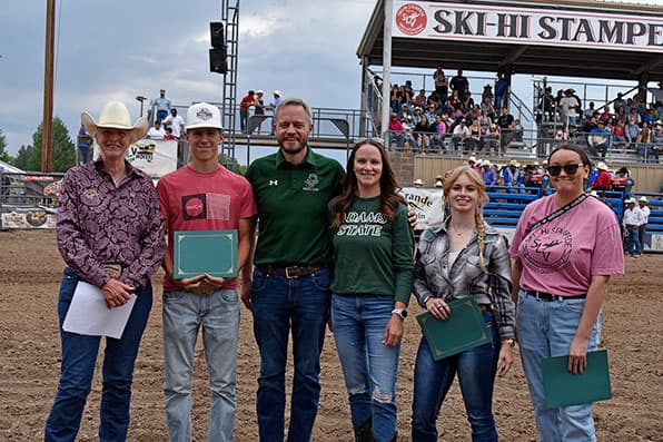 Pictured, left to right, Ski-Hi Stampede Committee Director Karla Willschau, scholarship recipient Cade Temple, Adams State President David Tandberg, Ph.D., Darin Tandberg, scholarship recipients Jessie Barraclough and Olivia Miller. The recipients received a $3,500 scholarship to attend Adams State at the 102 Annual Ski-Hi Stampede, Colorado’s Oldest Pro-Rodeo, on Sunday, July 14, 2024.