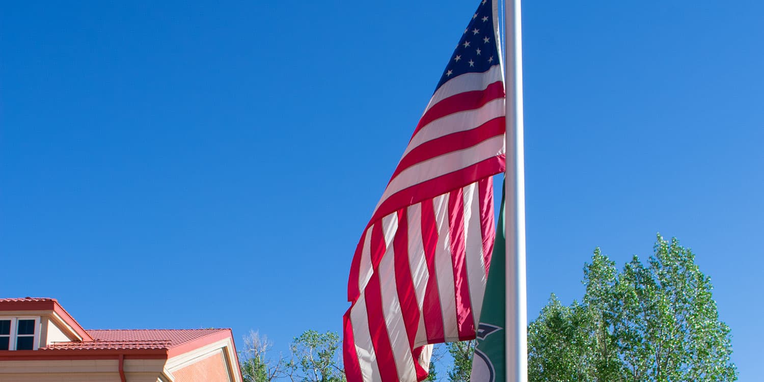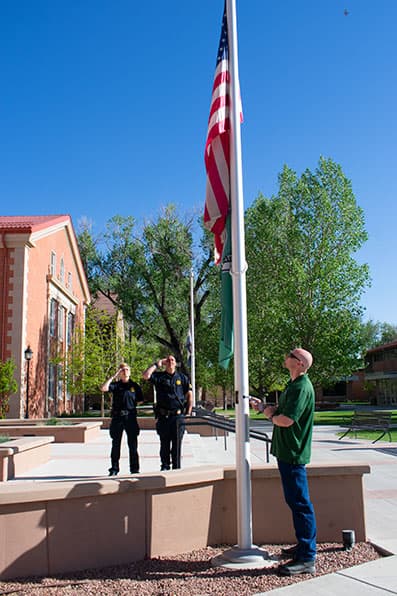 As Adams State Veteran Affairs Coordinator James Owens, lowers the flag to half mast, Adams State Police Chief Erika Derouin and Sgt. Jamie Coulson salute the U.S. Flag in memory of fellow police officers.