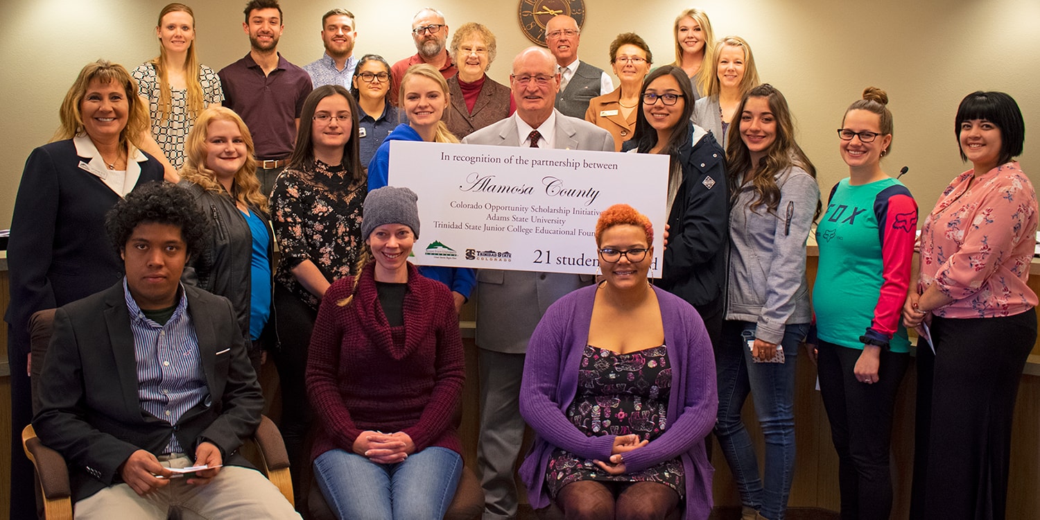 Through the Colorado Opportunity Scholarship Initiative Adams State University partnered with Alamosa County and Trinidad State Junior College Educational Foundation to provide scholarships for 21 students from Alamosa County. Adams State attended the Alamosa County Commissioners Meeting on February 13, in Alamosa, Colo., to express appreciation for the continued support.