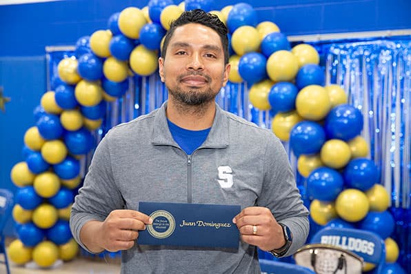In every endeavor, Dominguez is inspired by his roots as a bilingual student and first-generation college graduate. The son of migrant farmer workers, Dominguez began a career in food management before pivoting to education. In Texas he went from earning an alternative teaching certificate, to substituting and working his way through several aide and classroom teaching positions in Somerset ISD, to serving as a teacher leader. At Veterans Elementary, Dominguez continues his passion for bilingual education as a member of the bilingual team. Additionally, Dominguez has facilitated a districtwide study of culture called “Feria Mundial,” volunteered to coach sports, translated materials for events and has often lent a helping hand after hours.