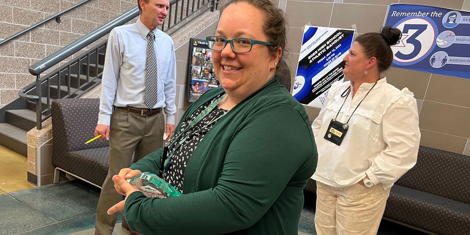 So it was with glee that colleagues turned the tables and asked her unexpectedly to show up at Center High Principal Nicole Neufeld’s office on Tuesday of this week. For a moment the teacher thought maybe she had done something wrong, wasn’t sure what it could be, but found it strange to be summoned to the principal’s office unscheduled.