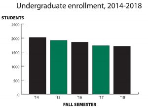 Driving Adams State’s enthusiasm that it can buck the trends of higher education and grow its enrollment is the fact undergraduate enrollment fell at much steeper declines in previous years, including a 6.7 percent drop from 2016 to 2017. The last time Adams State showed overall growth in its undergraduate population was 2011, when it grew by 2.4 percent from 2010 enrollment.