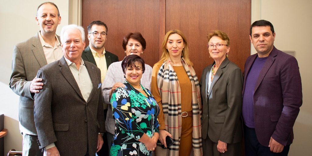 A delegation from the University of Prishtina, Kosovo, visited Adams State as part of their tour of Colorado. The delegation met with different groups on campus to discuss higher education’s role in rural schools. The delegation included, left to right, World Learning Organization Shpetim Bylykbashi, Edward Cooper, Ph.D.; Univ. of Prishtina Steering Council Ujkan Bajra, Ph.D.; Member of the UP Governing Council Drita Shoshi-Begolli; Monika Coulson, interpreter; Executive Director of Leadership and Growth Council Laura Kryeziu-Selimi; ASU President Cheryl D. Lovell; Univ. of Prishtina Steering Council Fadil Osmani, Ph.D.