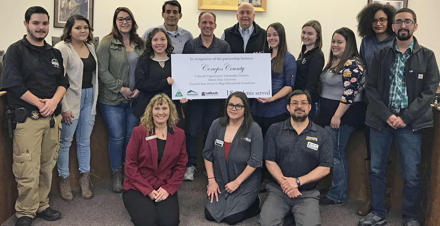 Through the Colorado Opportunity Scholarship Initiative Adams State University partnered with Conejos County and Trinidad State Junior College Educational Foundation to provide scholarships for 18 students from Conejos County. Adams State attended the Regular Board of Conejos County Commissioners Meeting on February 7, in Conejos, Colo., to express appreciation for the continued support.