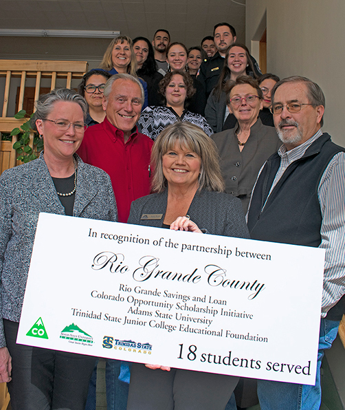 Through the Colorado Opportunity Scholarship Initiative Adams State University partnered with Rio Grande Savings and Loan and Trinidad State Junior College Educational Foundation to provide scholarships for 18 students from Rio Grande County. Adams State attended the Rio Grande County Commissioners Meeting on March 13, in Del Norte, Colo., to express appreciation to RGSL for their support. Pictured, left to right, front: Rio Grande County Commissioner Suzanne Bothell, Rio Grande County Commissioner John Noffsker, RGSL President and CEO Kathy Woods, Adams State President Cheryl Lovell, Rio Grande County Commissioner Gene Glover. Adams State Director of Alumni and Relations Lori Laske and TSJC Assistant Director of Financial Aid Yvette Lujan stand with Adams State and TSJC students, in no particular order: Fawn LeBlanc, ASU senior; L.T. Vigil, ASU sophomore; Michael Ray Vigil, ASU senior; Isabel Contreras, ASU freshman; Victoria Jaramillo, ASU junior; Mayra McKibbon, ASU junior; Stella Espinoza, TSJC; Amanda Andrews, and TSJC; Kris Donaldson, TSJC.