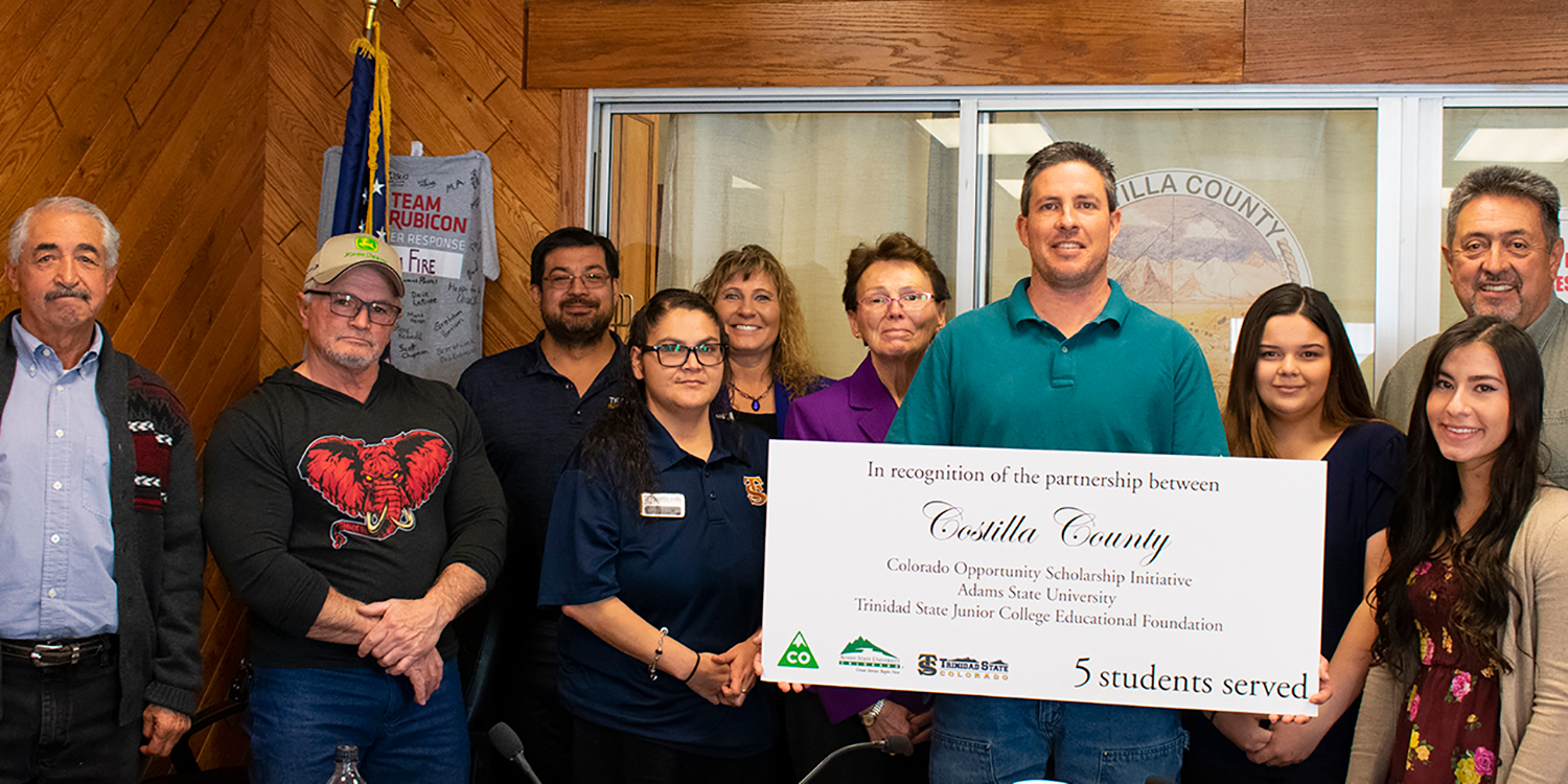 Through the Colorado Opportunity Scholarship Initiative Adams State University partnered with Costilla County and Trinidad State Junior College Educational Foundation to provide scholarships for five students from Costilla County. Adams State attended the Regular Board of Costilla County Commissioners Meeting on February 5, in San Luis, Colo., to express appreciation for the continued support.