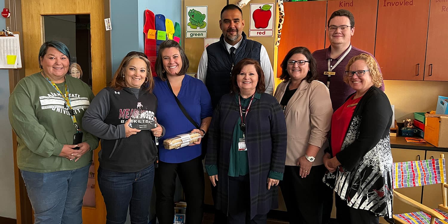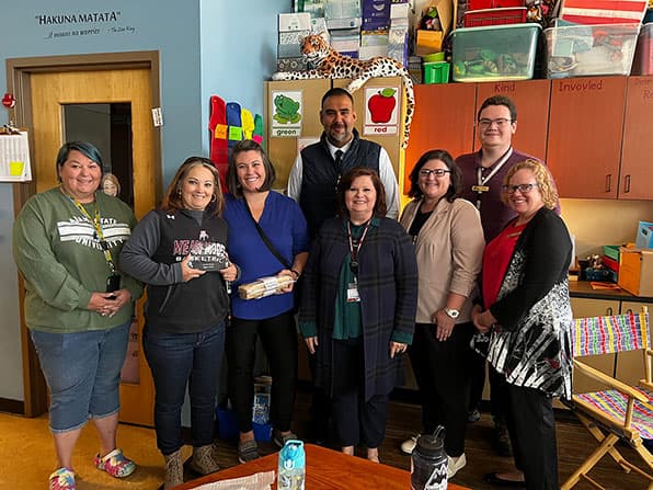 PHOTO CUTLINE: Adams State faculty Michele Mann, left, Educator Highlight Award honoree Leanna Brazel, AES K-2 Principal Roxanne Vigil, ASD Assistant Superintendent Luis Murillo, ASD Superintendent Diana Jones, Chrissy McKinney and Paul Clark of Adams State University School of Education, and Adams State faculty Justine Schwarz.