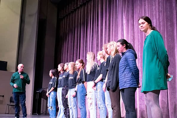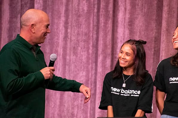 Coach Damon Martin introduces the 2021 Women’s DII National Championship Cross Country Team. Far right, first female Athletic Director Katelyn Smith, and (in blue jacket) Running Assistant Coach Emma Wren, VanDerVeer Fellow, supported through the Women’s Sports Foundation.