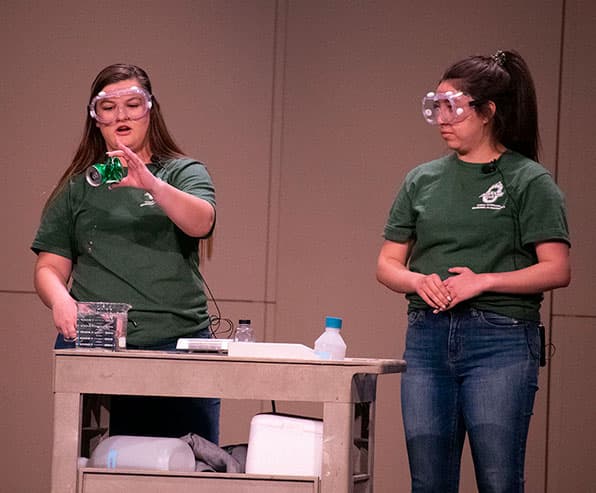 Chemistry majors Breanna Shaffer and Hailey Velasquez demonstrate a couple simple experiments.Ty Coleman keeps the audience updated on latest donations.