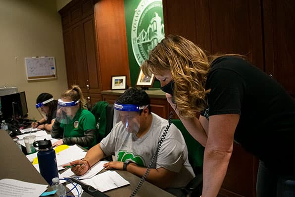 Adams State students Lindsey Sandoval, Alexis Sanchez-Duran, and Jose Villagomez, answer the phones as Executive Director of the Foundation Tammy Lopez tallies up the donations.