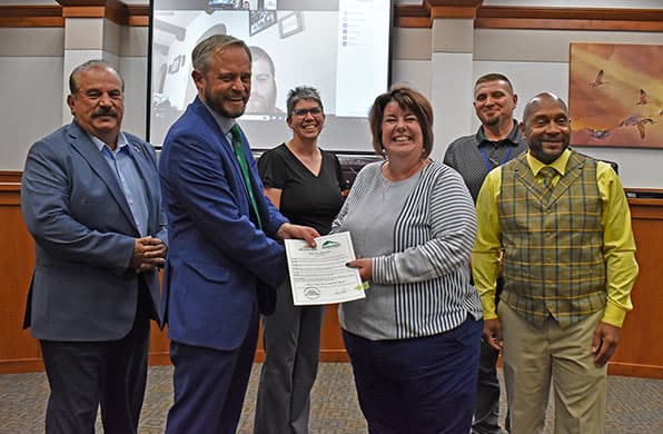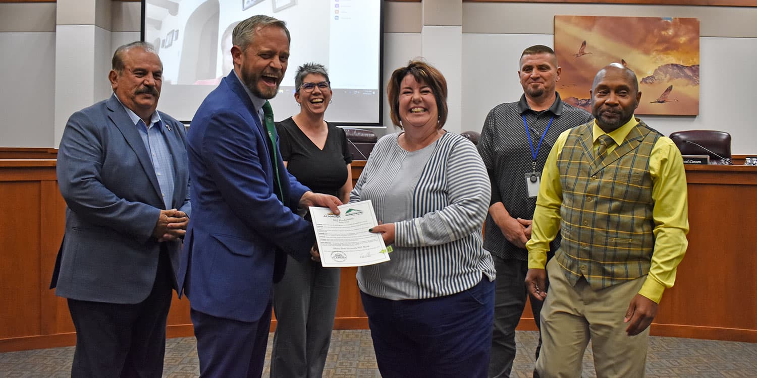 Pictured, left to right, Mayor Pro Tem Charlie Griego; Adams State President David Tandberg, Ph.D.; Alamosa City Councilors Kristina Daniel; Liz Hensley, Ph.D.; and Michael Carson; and Alamosa Mayor Ty Coleman.