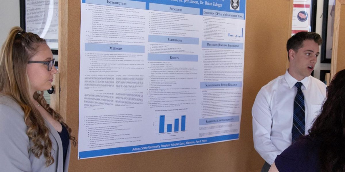 .Adams State University students are offered several opportunities to conduct research in their chosen fields and present their findings at professional conferences. Psychology majors participated in the Rocky Mountain Psychological Association Conference (RMPA) and Students Scholar Days (SSD) during the month of April. Two groups of students won awards at SSD, including first place poster: Christian Corah and Libby Weeks; and third place abstract: Christian Corah, Terrell Russell, and Isaac Serrano.