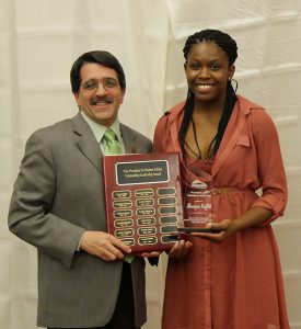 Vice President of Student Services Ken Marquez presented Sheniqua Griffith with the Vice President for Student Services Outstanding Leadership Award, which included a $1,000 scholarship and $100 VISA Gift Card. Griffith has served as a Resident Assistant, the President of Multicultural Student Governance, New Student Orientation Mentor, on the Grizzly Activities Board, in Student Life, in CASA activities and many other organizations and committees across campus. “Sheniqua has been a part of so many amazing things on are campus,” Marquez said. “She is an amazing leader and also always has a huge smile on her face.”