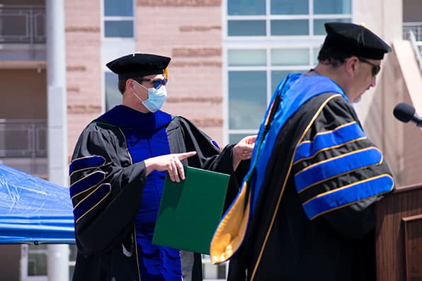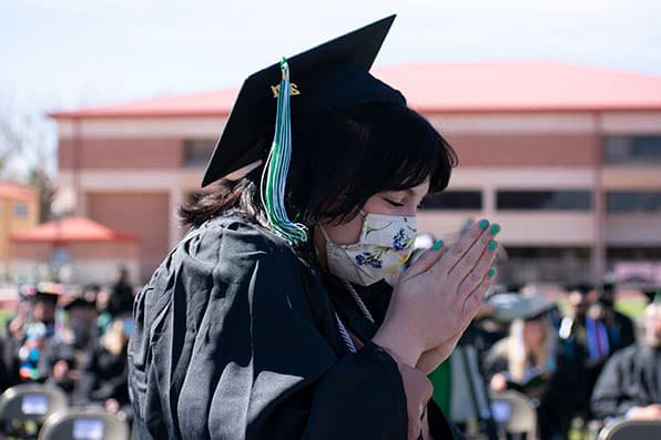 Ph.D. candidate Melissa O’Neill was the graduate commencement speaker.The Graduate Commencement Ceremony began at 1 p.m. Jonathan Benz accepts his doctoral degree as he crosses the platform.Photo by Alexis Sanchez-Duran: The class of 2021 expresses appreciation to guests for their support and encouragement.