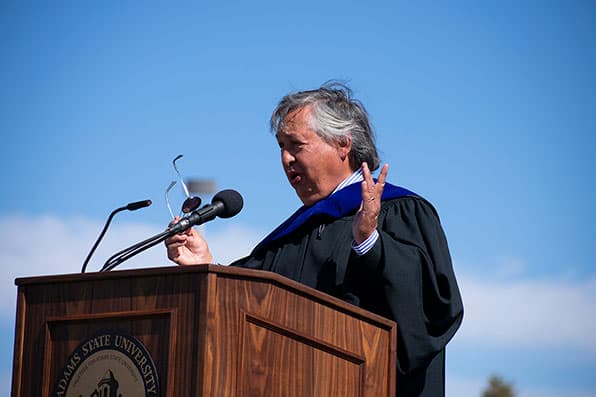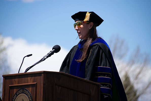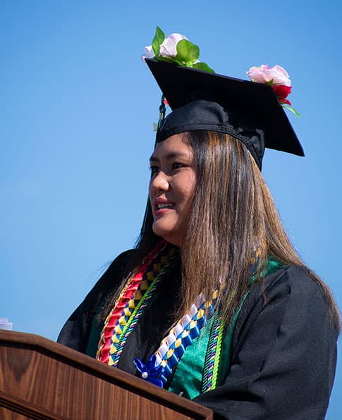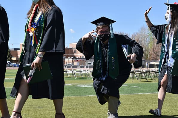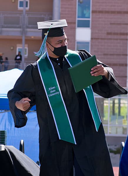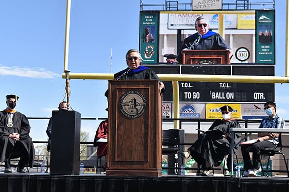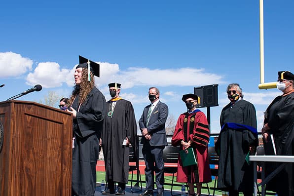 Adeline Sabedo, 2021 nursing major, engaged her fellow graduates with humor and insight as the student speaker during the undergraduate ceremony which began at 9 a.m.Photo by Alexis Sanchez-Duran: The Honorable Carlos Lucero was the Undergraduate Commencement Ceremony speakerHonorable Carlos LuceroHannah Eubanks, theatre major, is excited to receive her diploma.Students pick-up their diplomas and cross the stage at the first in-person commencement ceremony in over a year.Music major Alonna Younger closes the undergraduate commencement ceremony by singing the Alma Mater.Photo by Alexis Sanchez-Duran: Exiting Rex Field, undergraduates show their excitement as they leave for the next chapter of their great story.