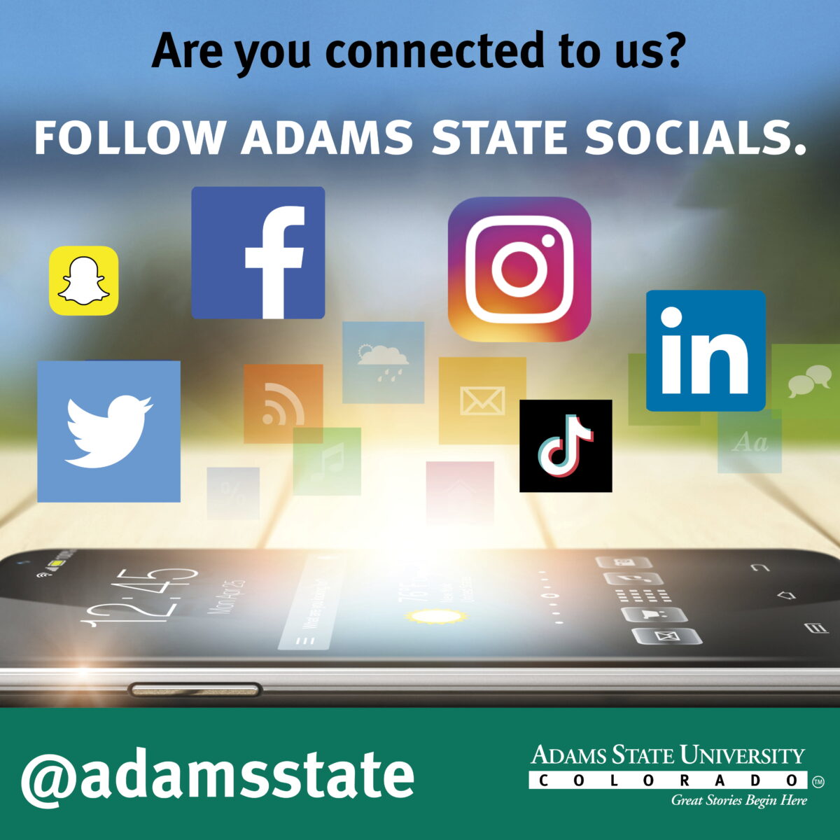 Are you connected to us? Follow Adams State Socials. @adamsstate Adams State University Colorado. tm Great Stories Begin Here. Logos for Snapchat, Tik Tok, Facebook, Instagram, LinkedIn, Twitter.
